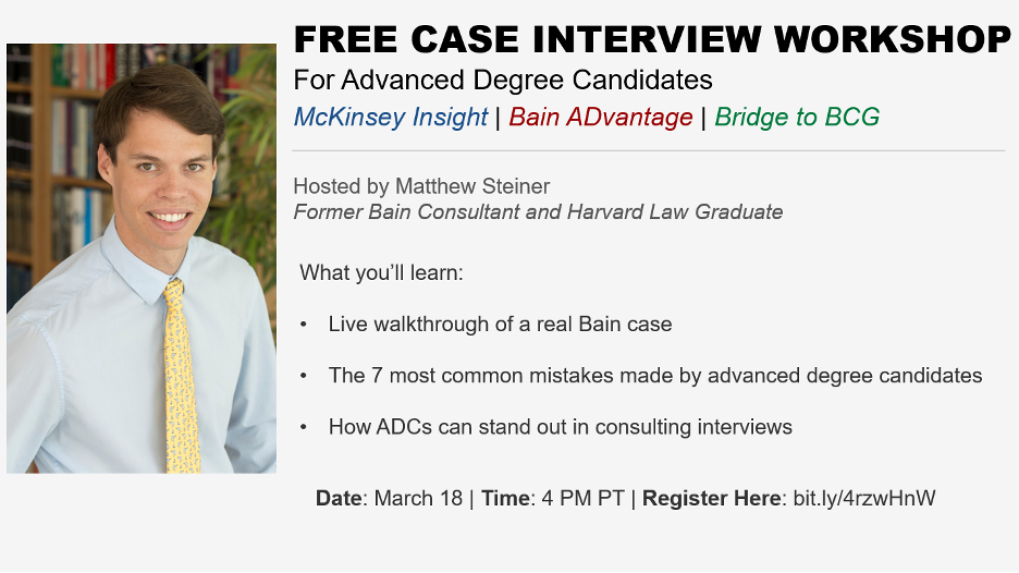 ADCC will be hosting a free case interview workshop! Join Matt Steiner, a former Bain consultant and Harvard Law graduate, for a free workshop for PhDs, MDs, JDs, and other advanced degree candidates preparing for McKinsey Insight, Bain ADvantage, and Bridge to BCG.